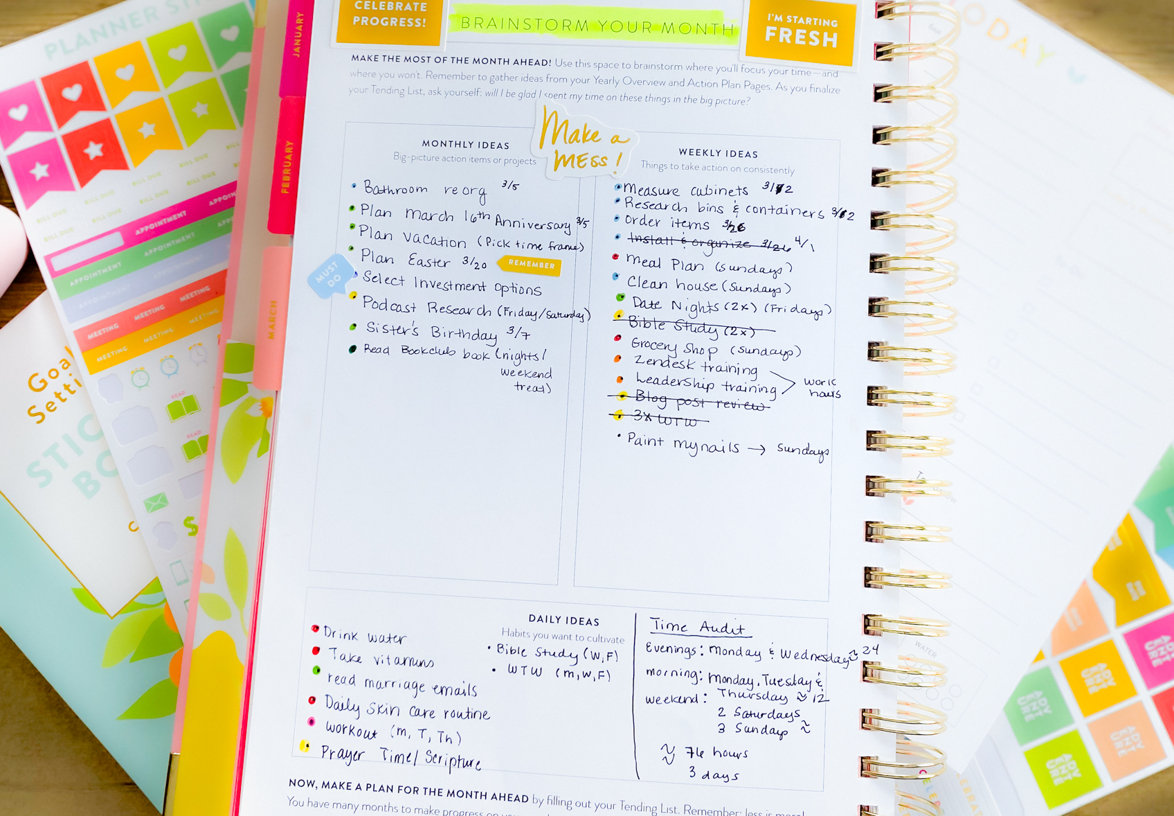 This was so helpful! I’ve never felt clear about how to use the Brainstorm Your Month page and this really helped to break it down for me! I also love your time audit idea! Thank you!